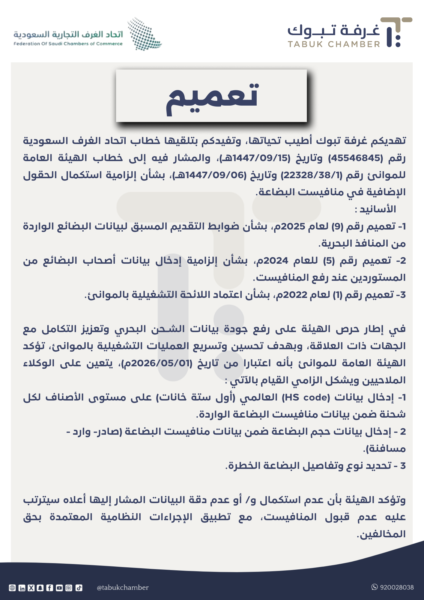 تهديكم غرفة تبوك أطيب تحياتها، وتفيدكم بتلقيها خطاب اتحاد الغرف السعودية رقم (45546845) وتاريخ (1447/09/15هـ)، والمشار فيه إلى خطاب الهيئة العامة للموانئ رقم (22328/38/1) وتاريخ (1447/09/06هـ)، بشأن إلزامية استكمال الحقول الإضافية في منافيست البضاعة. الأسانيد : 1- تعميم رقم (9) لعام 2025م، بشأن ضوابط التقديم المسبق لبيانات البضائع الواردة من المنافذ البحرية. 2- تعميم رقم (5) للعام 2024م، بشأن إلزامية إدخال بيانات أصحاب البضائع من المستوردين عند رفع المنافيست. 3- تعميم رقم (1) لعام 2022م، بشأن اعتماد اللائحة التشغيلية بالموانئ. في إطار حرص الهيئة على رفع جودة بيانات الشـحن البحري وتعزيز التكامل مع الجهات ذات العلاقة، وبهدف تحسين وتسريع العمليات التشغيلية بالموانئ، تؤكد الهيئة العامة للموانئ بأنه اعتبارا من تاريخ (2026/05/01م)، يتعين على الوكلاء الملاحيين ويشكل الزامي القيام بالآتي : 1- إدخال بيانات (HS code) العالمي (أول ستة خانات) على مستوى الأصناف لكل شحنة ضمن بيانات منافيست البضاعة الواردة. 2 - إدخال بيانات حجم البضاعة ضمن بيانات منافيست البضاعة (صادر- وارد - مسافنة). 3 - تحديد نوع وتفاصيل البضاعة الخطرة. وتؤكد الهيئة بأن عدم استكمال و/ أو عدم دقة البيانات المشار إليها أعلاه سيترتب عليه عدم قبول المنافيست، مع تطبيق الإجراءات النظامية المعتمدة بحق المخالفين.