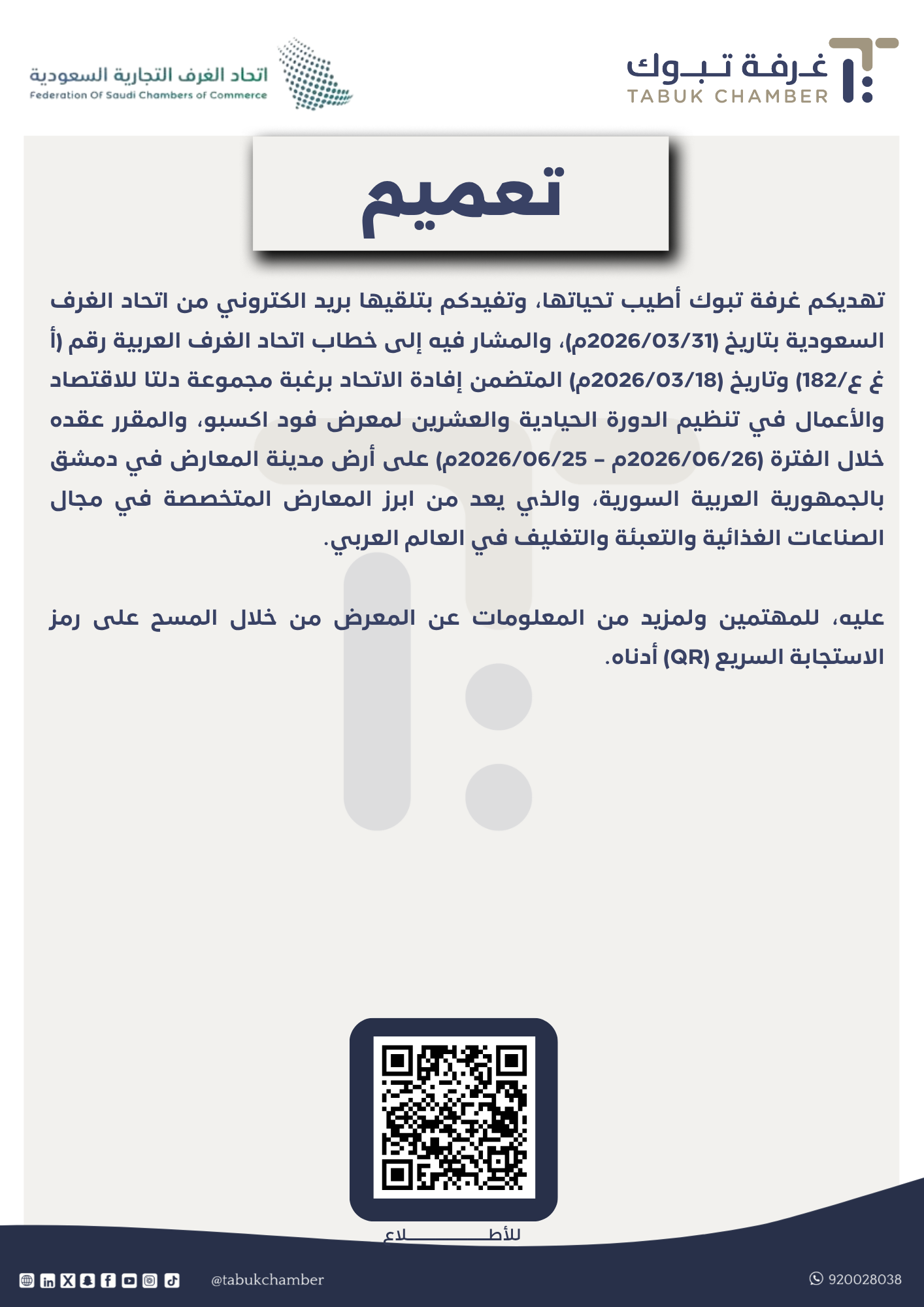 تهديكم غرفة تبوك أطيب تحياتها، وتفيدكم بتلقيها بريد الكتروني من اتحاد الغرف السعودية بتاريخ (2026/03/31م)، والمشار فيه إلى خطاب اتحاد الغرف العربية رقم (أ غ ع/182) وتاريخ (2026/03/18م) المتضمن إفادة الاتحاد برغبة مجموعة دلتا للاقتصاد والأعمال في تنظيم الدورة الحيادية والعشرين لمعرض فود اكسبو، والمقرر عقده خلال الفترة (2026/06/26م – 2026/06/25م) على أرض مدينة المعارض في دمشق بالجمهورية العربية السورية، والذي يعد من ابرز المعارض المتخصصة في مجال الصناعات الغذائية والتعبئة والتغليف في العالم العربي. عليه، للمهتمين ولمزيد من المعلومات عن المعرض من خلال المسح على رمز الاستجابة السريع (QR) أدناه.