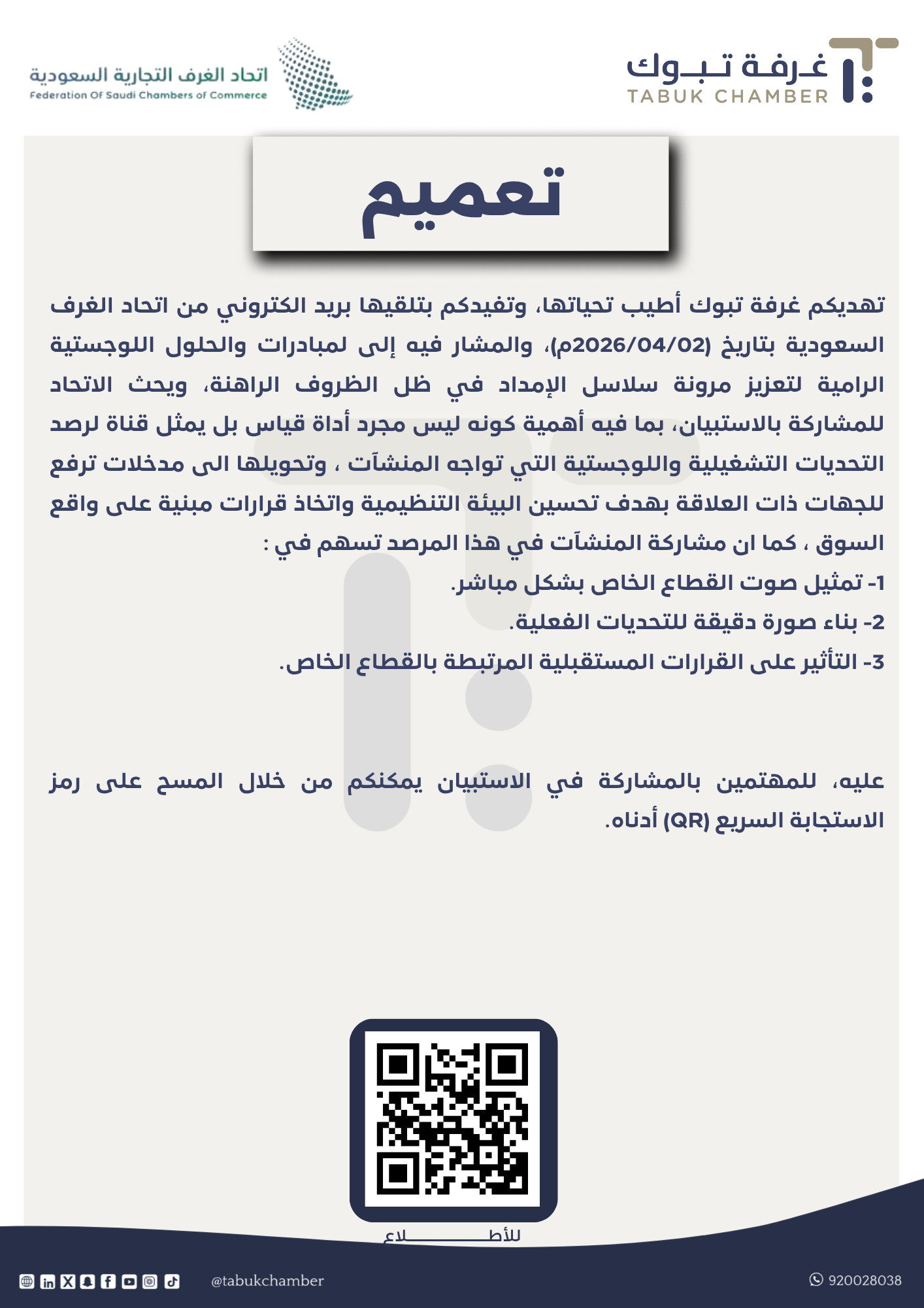 تهديكم غرفة تبوك أطيب تحياتها، وتفيدكم بتلقيها بريد الكتروني من اتحاد الغرف السعودية بتاريخ (2026/04/02م)، والمشار فيه إلى المبادرات والحلول اللوجستية الرامية لتعزيز مرونة سلاسل الإمداد في ظل الظروف الراهنة، ويحث الاتحاد للمشاركة بالاستبيان، بما فيه أهمية كونه ليس مجرد أداة قياس بل يمثل قناة لرصد التحديات التشغيلية واللوجستية التي تواجه المنشآت ، وتحويلها الى مدخلات ترفع للجهات ذات العلاقة بهدف تحسين البيئة التنظيمية واتخاذ قرارات مبنية على واقع السوق ، كما ان مشاركة المنشآت في هذا المرصد تسهم في : 1- تمثيل صوت القطاع الخاص بشكل مباشر. 2- بناء صورة دقيقة للتحديات الفعلية. 3- التأثير على القرارات المستقبلية المرتبطة بالقطاع الخاص. عليه، للمهتمين بالمشاركة في الاستبيان يمكنكم من خلال المسح على رمز الاستجابة السريع (QR) أدناه.