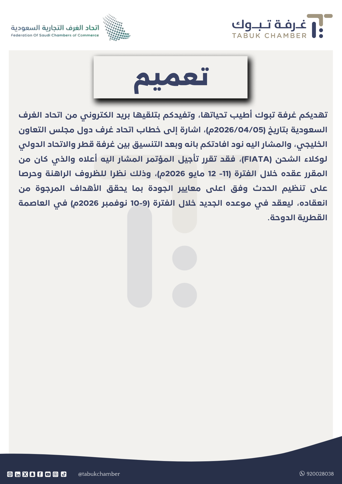 تهديكم غرفة تبوك أطيب تحياتها، وتفيدكم بتلقيها بريد الكتروني من اتحاد الغرف السعودية بتاريخ (2026/04/05م)، اشارة إلى خطاب اتحاد غرف دول مجلس التعاون الخليجي، والمشار اليه نود افادتكم بانه وبعد التنسيق بين غرفة قطر والاتحاد الدولي لوكلاء الشحن (FIATA)، فقد تقرر تأجيل المؤتمر المشار اليه أعلاه والذي كان من المقرر عقده خلال الفترة (11- 12 مايو 2026م)، وذلك نظرا للظروف الراهنة وحرصا على تنظيم الحدث وفق اعلى معايير الجودة بما يحقق الأهداف المرجوة من انعقاده، ليعقد في موعده الجديد خلال الفترة (9-10 نوفمبر 2026م) في العاصمة القطرية الدوحة.